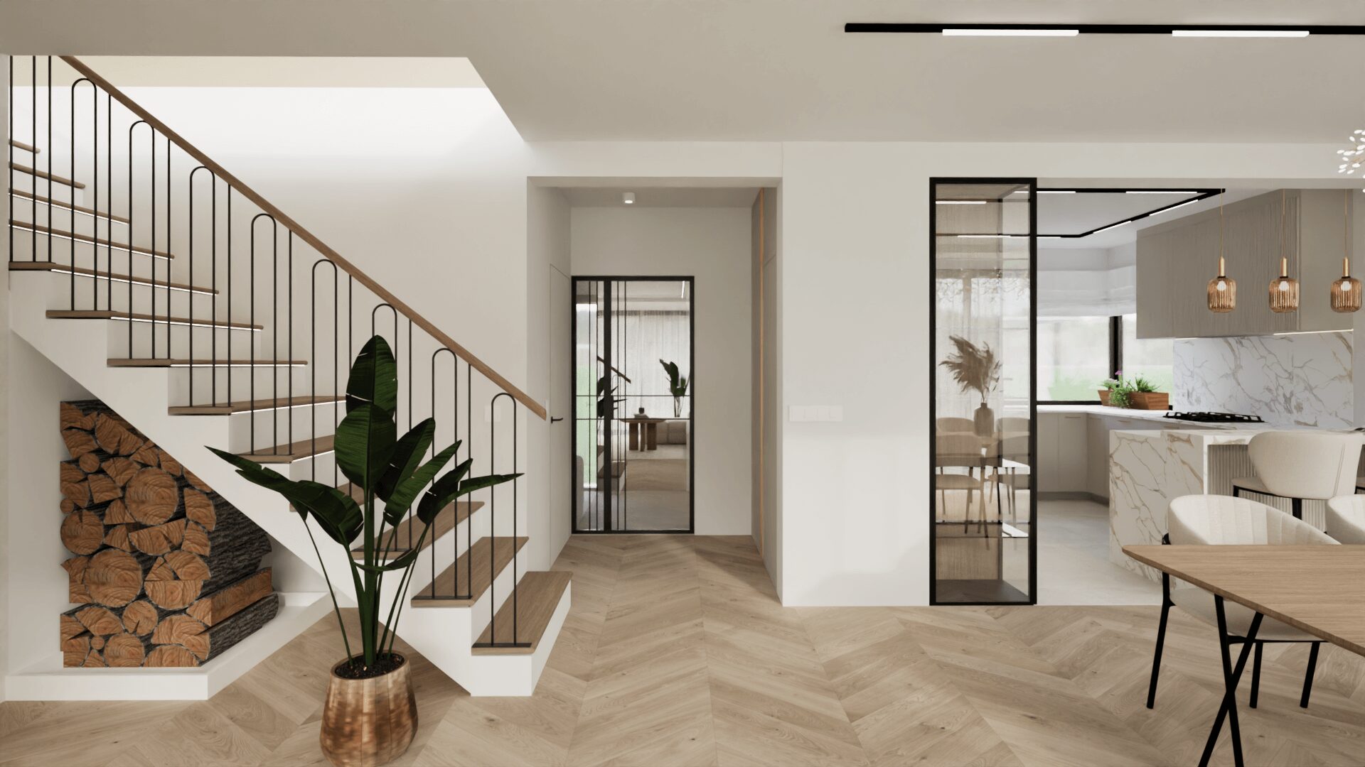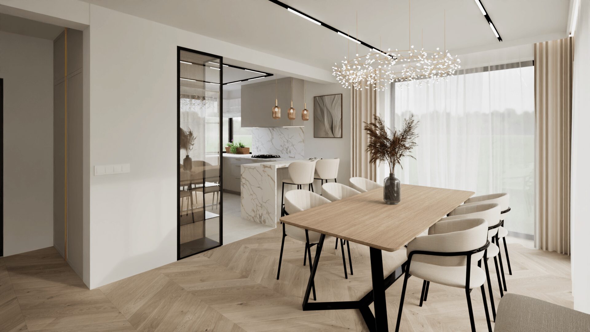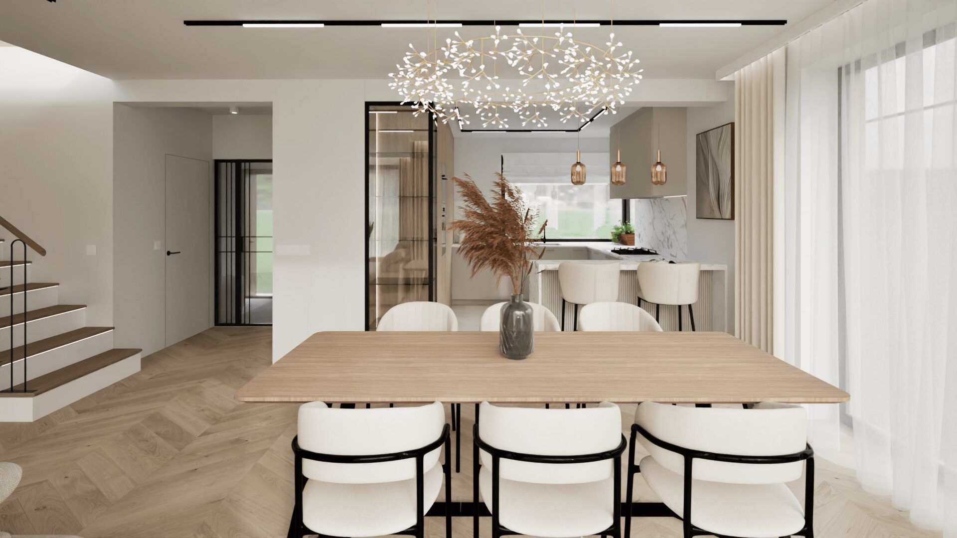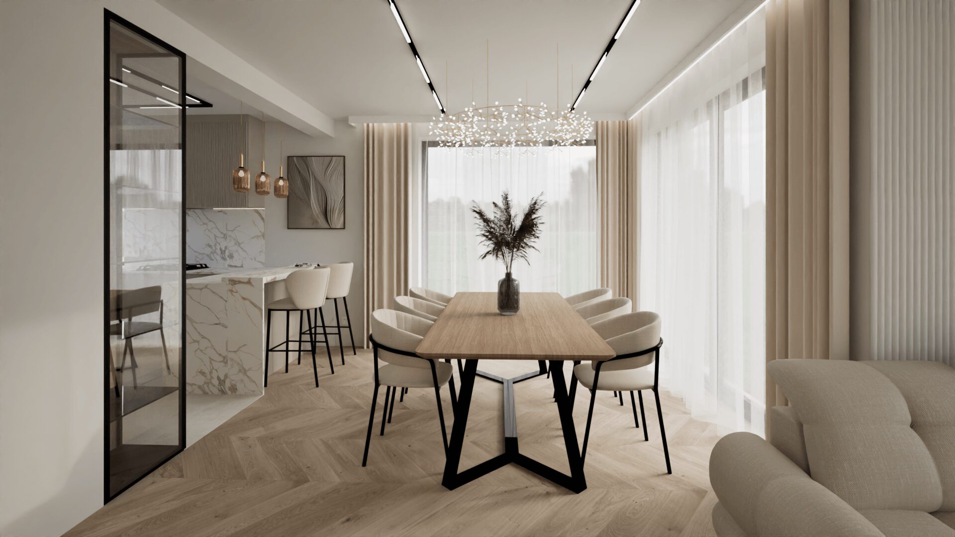 Projekt wnętrz strefy dziennej w domu jednorodzinnego z elementami modern classic i japandi pod Tarnowem Powrót do Portfolio