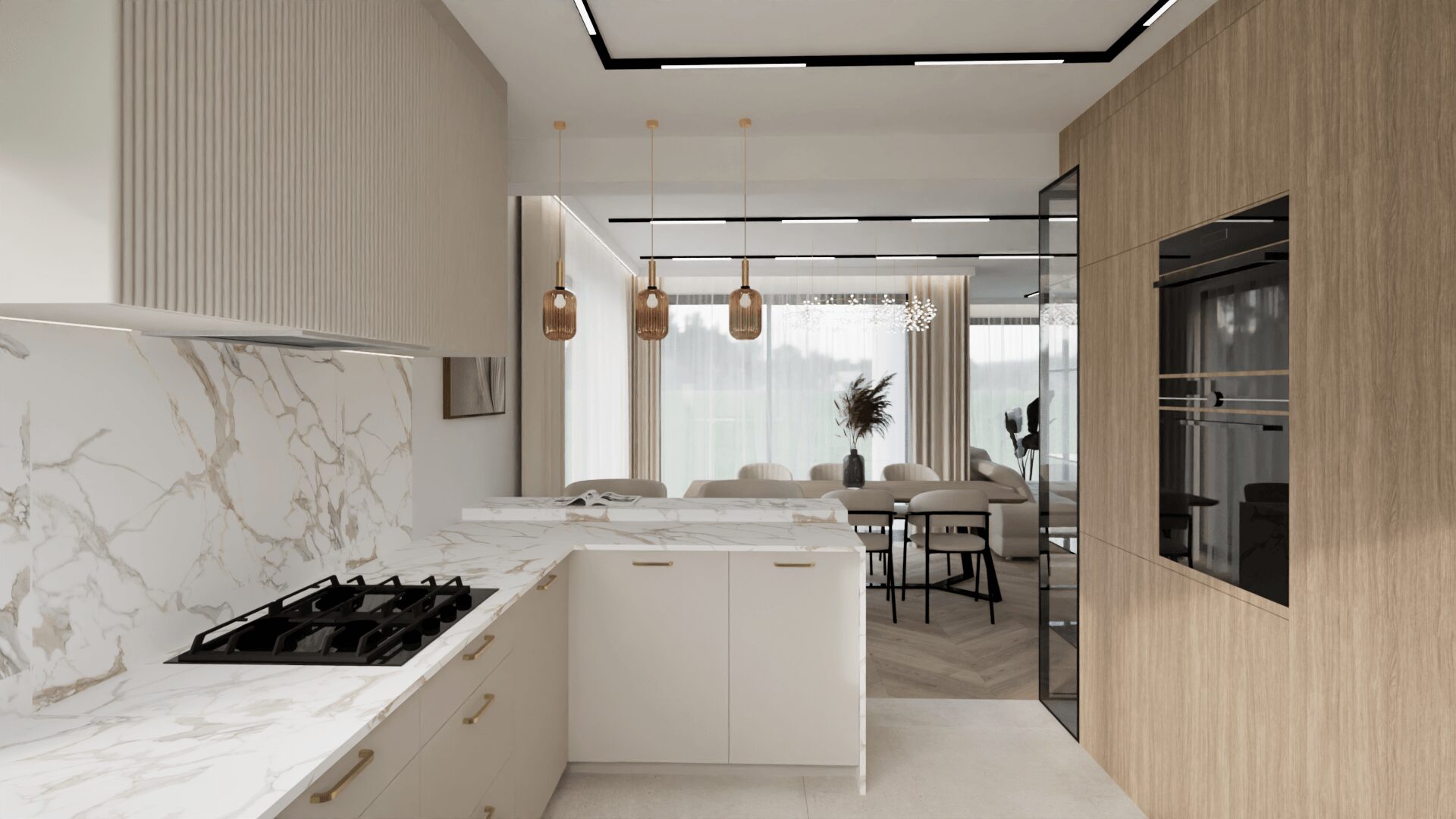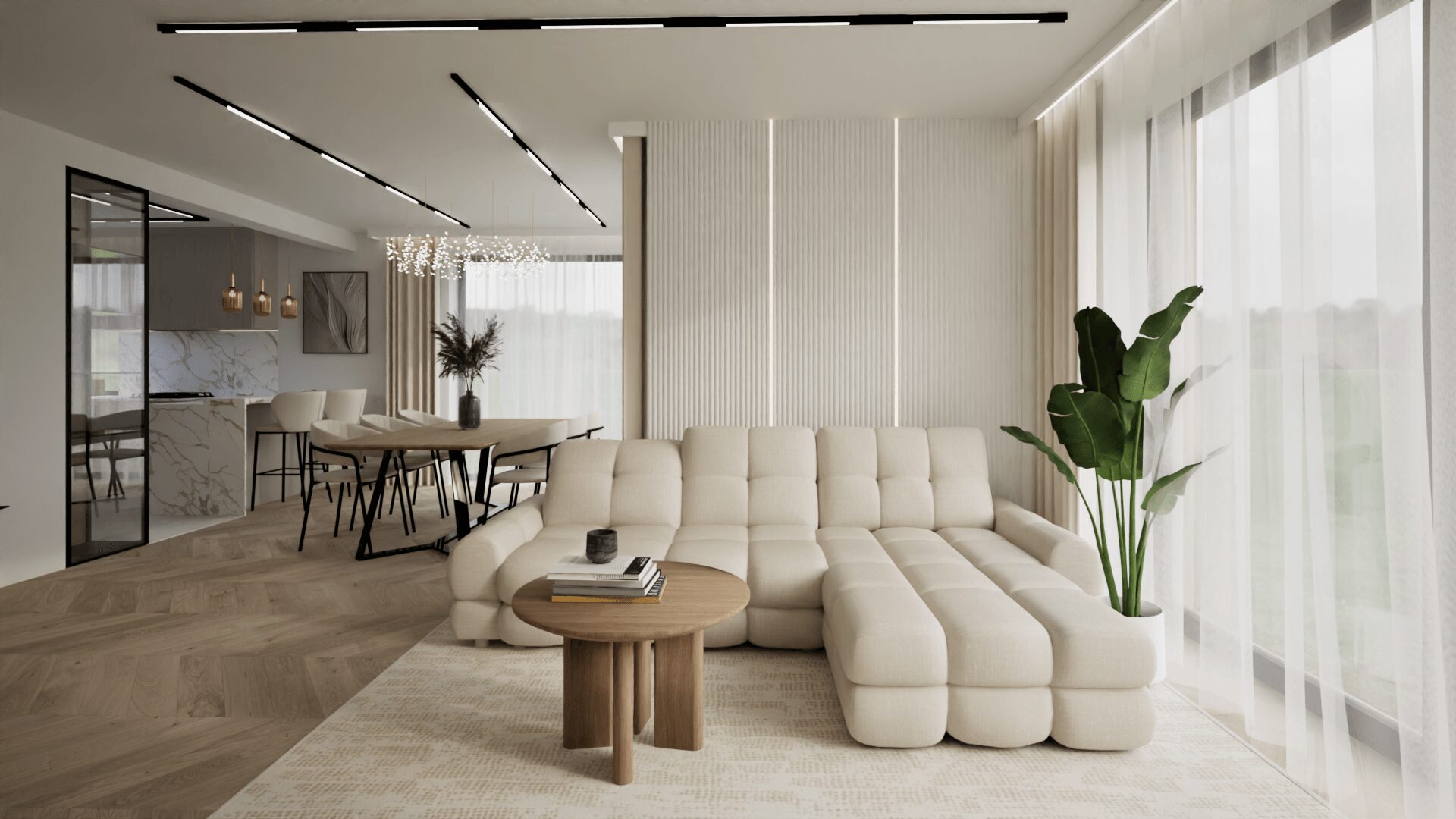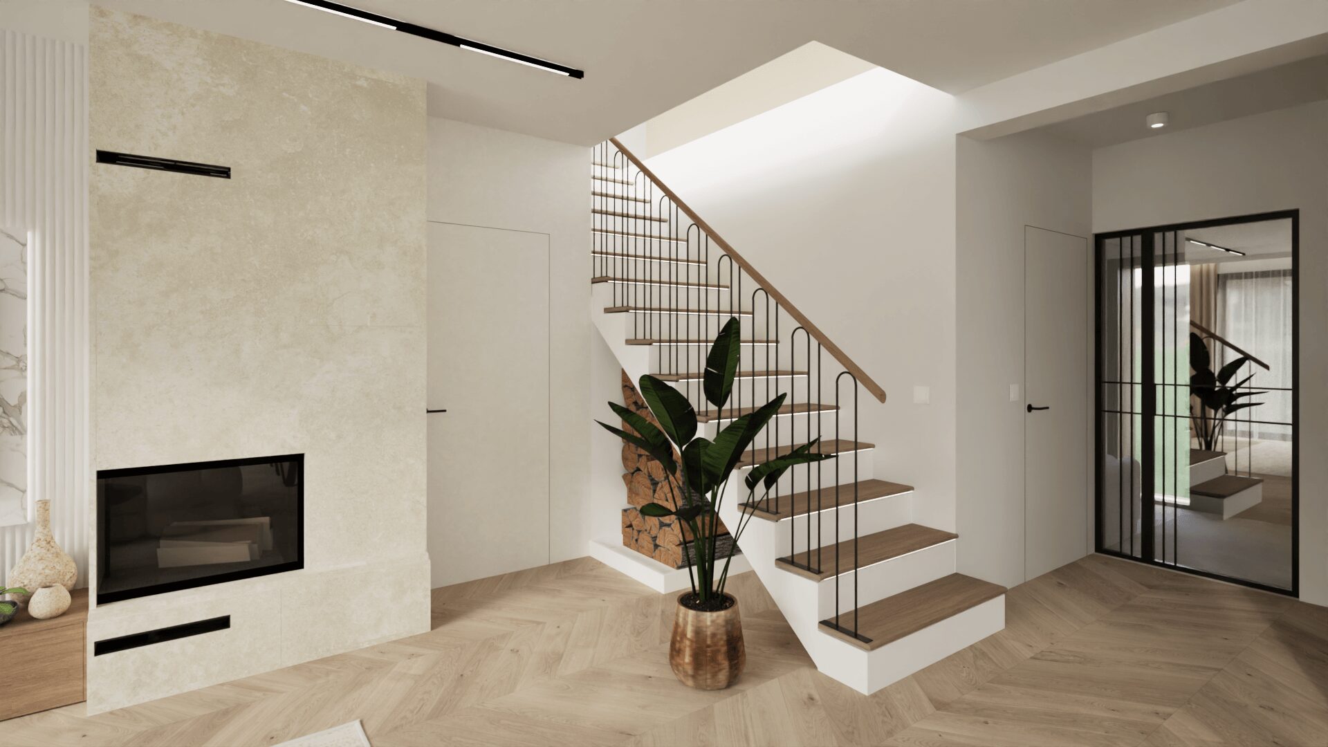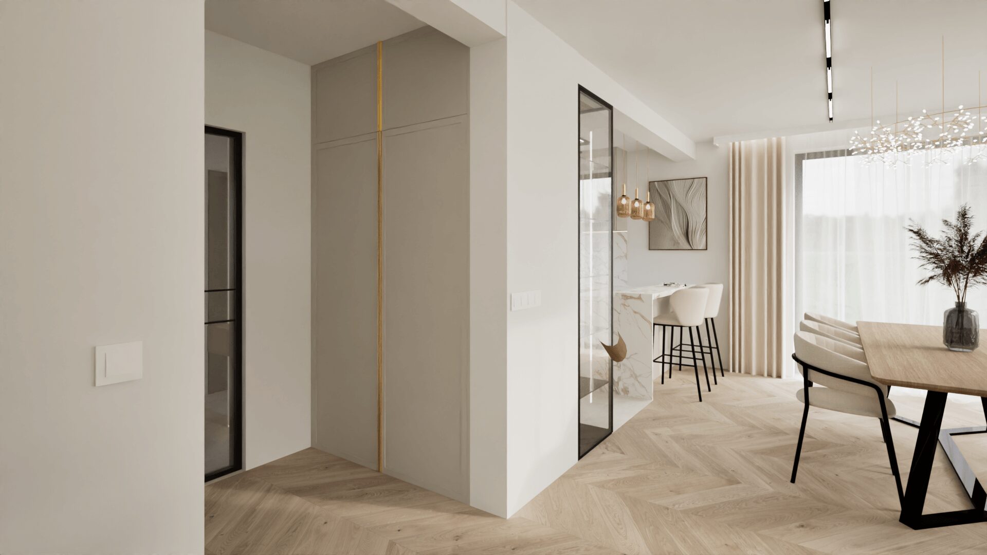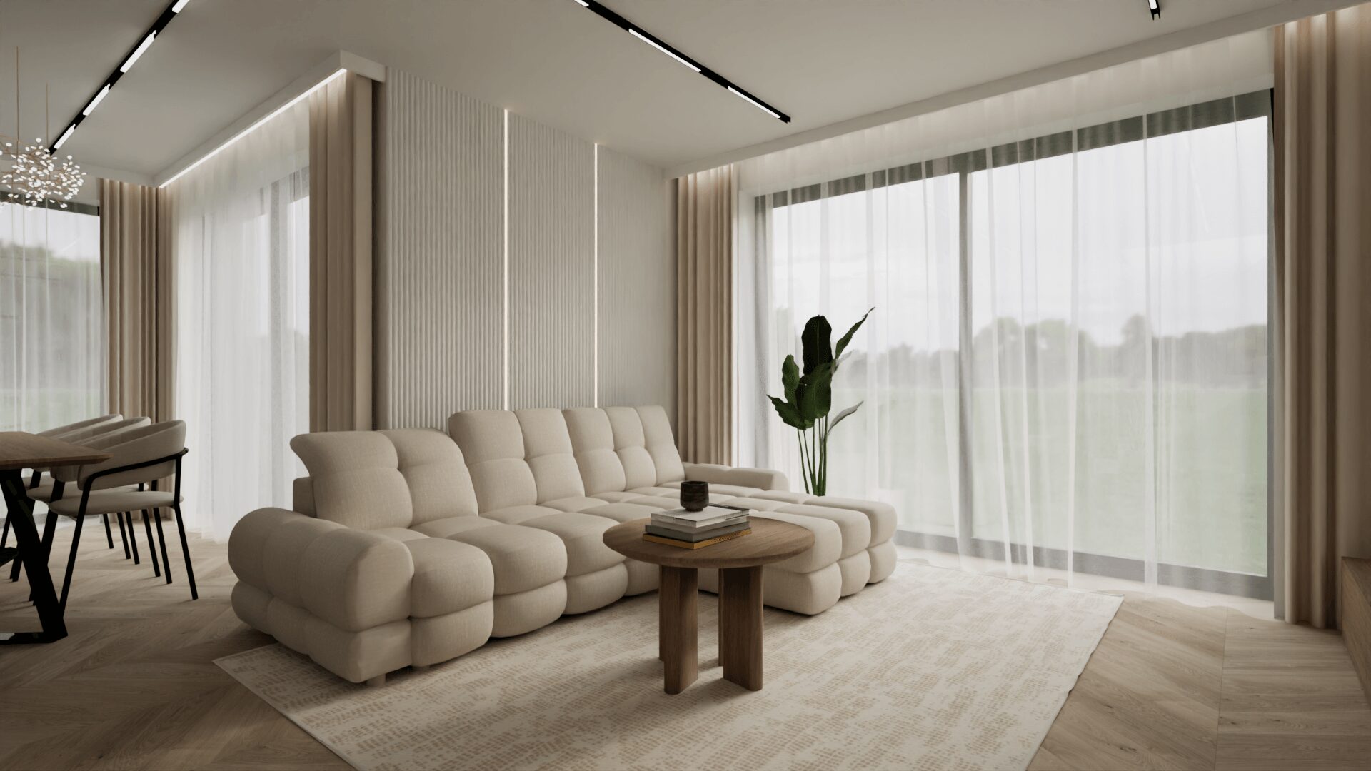 Projekt wnętrz strefy dziennej w domu jednorodzinnego z elementami modern classic i japandi pod Tarnowem Powrót do Portfolio